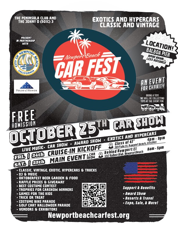 The Newport Beach Car Fest 2025 at Balboa Island Pier will benefit our local law enforcement and community, and we look forward to having you join and support us with our worthy endeavor. This event is a family-friendly fundraiser, attracting both residents and tourists from near and far. We are anticipating over 200 Vintage, Classic , Exotic- Hyper Cars and Trucks in addition to displays by The City of Newport Beach and various vendors, exhibits , food, beverage and music! It all happens behind the Newport Beach EL at 1327 West Balboa Blvd , Newport Beach CA 92661! The Johnny O Foundation in partnership with The Newport Beach Car Fest 501(c)(3) organization.